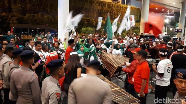 Seperti saat pendukung nomor dua menggeser alat musiknya agar dekat dengan pendukung nomor urut satu yang memilih duduk dan menyaksikan debat. "Tolong kembali ke posisi semula. Digeser alat alatnya, jangan memancing. Ayo sama-sama jaga kondisi dan kebersamaan serta saling hormati," kata salah satu polisi kepada pendukung nomor urut 2. (ze/iwd)