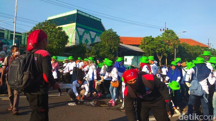 Namun sebagian massa terutama perwakilan Federasi Serikat Pekerja Metal Indonesia (FSPMI), khususnya yang perempuan mengeluarkan tas plastik dan memungut sampah-sampah di jalan.