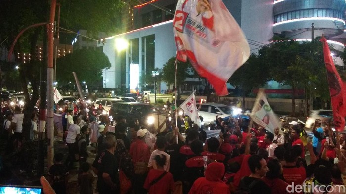 Akibat ratusan pendukung yang saling beradu yel-yel di samping gedung Dyandra Convention Center, Jalan Basuki Rahmat menjadi macet. Polisi pun beberapa kali mengimbau para pendukung dua paslon itu.