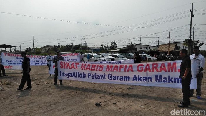 Salah satu spanduk yang mereka bawa bertuliskan 'Sikat Habis Mafia Garam Insya Allah Petani Garam Akan Makmur'. Ketua Forum Petani Garam Madura, Muhammad Yanto mengatakan pihaknya mendukung langkah kepolisian yang telah berhasil mengungkap mafia garam.
