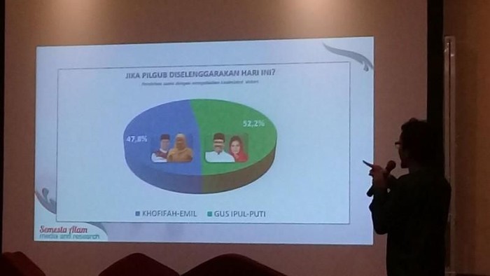 Jika warga masyarakat yang belum memilih itu, sebesar 11,8 persen, dibagi dua pasangan calon maka Gus Ipul-Puti Guntur Soekarno akan keluar sebuah juara di Pilkada Jawa Timur. "Pasangan nomor 2 ini memperoleh 52,2 persen," kata Riansyah dalam presentasinya.