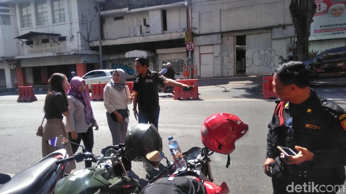 Para pejalan kaki ini pun mendapatkan teguran dari petugas kepolisian, Linmas dan TNI yang sedang berjaga di Pos Pam Polsek Tegalsari yang berada di depan Tunjungan Plaza.
