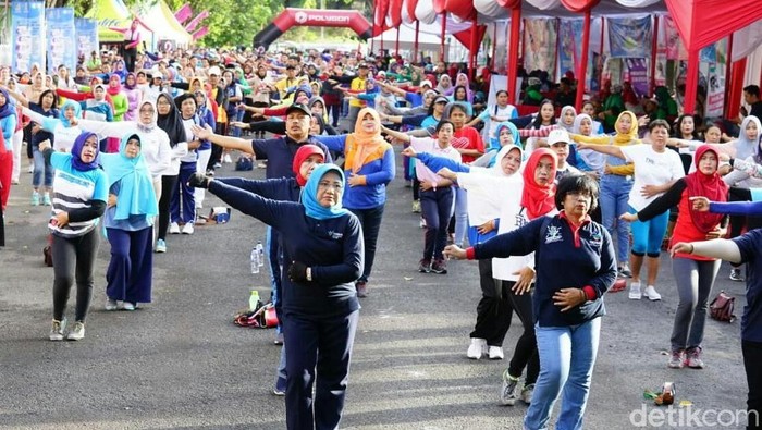 Senam aerobic yang diikuti dengan senam kreasi I Love Banyuwangi dan senam Asian Games semakin menambah semangat para peserta yang tengah melakukan peregangan otot itu.