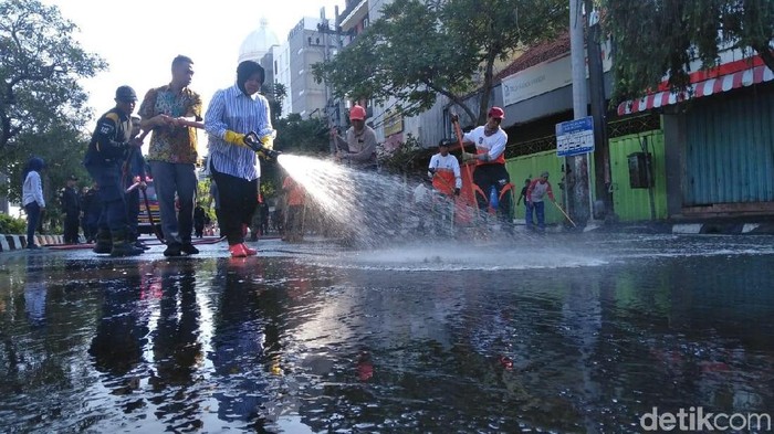 Dari pantauan detikcom, di setiap ruas Jalan Embong Malang dan Kedungdoro terlihat mobil mengiringi Risma saat menyemprot ke jalan. Bahkan Risma juga meminta kepada pemilik toko untuk menutup sementara agar trotoarnya dibersihkan.