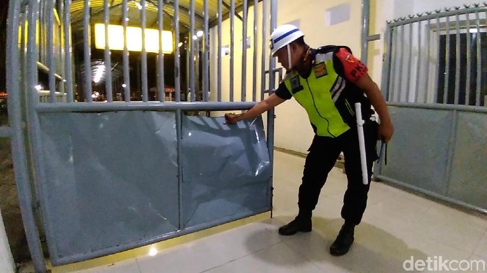 Sweeping itu dilakukan di pintu keluar Stasiun Pasar Turi, hingga membuat sebagian pagar pintu jebol dan rusak.