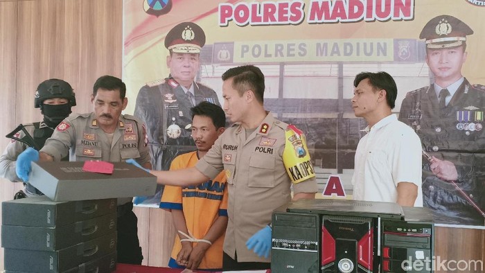 "Jadi pelaku ini satu komplotan dengan empat pelaku pencurian yang tertangkap di 5 kota di Jatim. Mereka komplotan pencuri komputer di Ponorogo, Trenggalek, Jombang, Nganjuk dan Lamongan," kata Kapolres Madiun AKBP Ruruh Wicaksono kepada wartawan.