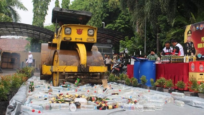 "Ada 1.325 botol yang kami musnahkan hari ini," ujar Kapolres Gresik AKBP Wahyu S Bintoro kepada wartawan usai pemusnahan miras di Mapolres Gresik, Kamis (20/12/2018).