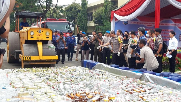 "Pada kesempatan ini akan dilakukan pemusnahan barang bukti sebanyak lebih kurang 9.735 botol yang banyak terdiri dari miras oplosan," kata Toni saat memusnahkan BB miras oplosan di Mapolda Jatim Jalan Ahmad Yani Surabaya, Jumat (21/12/2018).