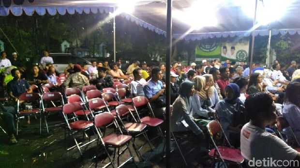 Meski hujan cukup lebat sejak pukul 18.00 hingga pukul 20.00 WIB, para relawan ini masih bertahan di bawah tenda untuk menyaksikan debat capres yang digelar di halaman posko pemenangan Prabowo-Sandi yang berada di kawasan Gedung Museum NU di Jalan Gayungsari Timur.