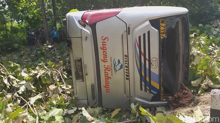 Seperti pantauan detikcom di lokasi, bus tersebut masih terguling di hutan jati. Puluhan warga meriung ingin melihat proses evakuasi yang akan dilakukan Unit Laka Lantas Polres Ngawi. (sun/iwd)