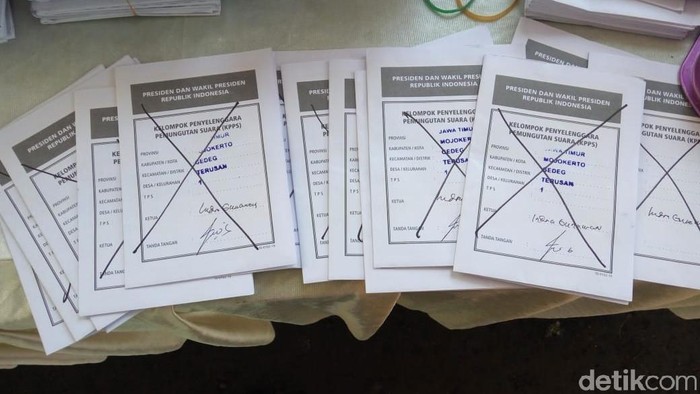 Ketua Bawaslu Kabupaten Mojokerto Aris Fakhruddin Asy'at mengatakan, surat suara tercoblos sejauh ini baru ditemukan di satu Tempat Pemungutan Suara (TPS), yaitu di TPS 01, Desa Terusan, Kecamatan Gedeg. Jumlahnya mencapai 15 lembar. Menurut dia, seluruh surat suara yang tercoblos adalah untuk Pilpres.