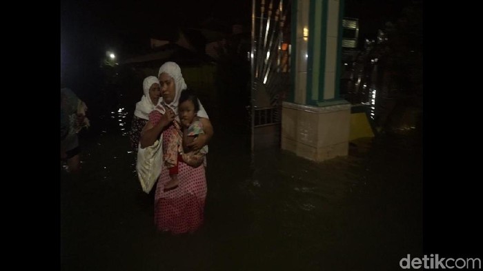 "Tetap dijalani saja. Tidak sedih, semoga air cepat surut agar bisa menjalankan ibadah salat tarawih seperti biasanya," kata Asmaul Husna sembari menggendong anaknya, Minggu (5/5/2019).