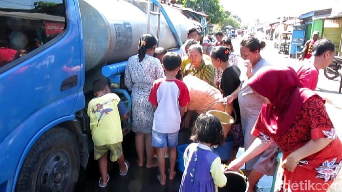 "Di Jepara 5 hari Mas. Karena dari got ini lho mMas pipanya rusak jadi airnya nggak bisa jalan, mati. Airnya baru kemarin Minggu dateng, tapi tidak layak pakai. Sekarang airnya bersih tapi tidak penuh tangkinya," kata Sugiarti kepada wartawan saat mengantre, Senin (7/1/2019).