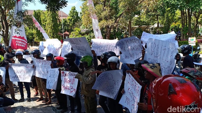 Sambil berorasi warga juga membentangkan berbagai poster bertuliskan kecaman terhadap Pemkab Ngawi. Salah satu poster bertuliskan tentang sikap bupati yang dianggap bersikap seenaknya sendiri.
