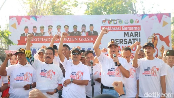 Acara senam sehat yang juga diikuti oleh forkompinda Gresik, seperti Kapolres Gresik AKBP Wahyu S Bintoro,Wakil Bupati Gresik M Qosim, Ketua MUI Gresik Maonser Sodiq, Ketua KPU Gresik A. Roni serta ribuan masyarakat Gresik itu mendeklarasikan bersama Mari Bersatu Bangun Indonesia "Kita semua saudara".