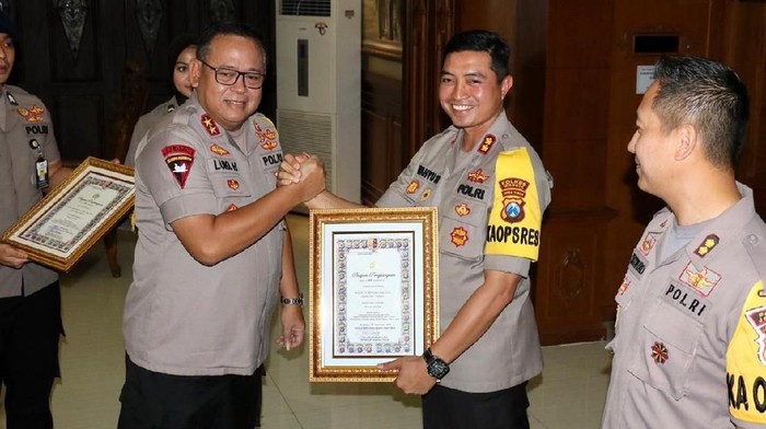Penghargaan diberikan langsung oleh Kapolda Jatim Irjen Luki Hermawan di Gedung Tribrata Polda Jatim, Senin (9/9/2019). Selain Wahyu, penghargaan untuk polisi teladan kedua dan ketiga adalah Kapolres Jember AKBP Kusworo Wibowo dan Kapolres Sidoarjo Kombes Zain Dwi Nugroho.