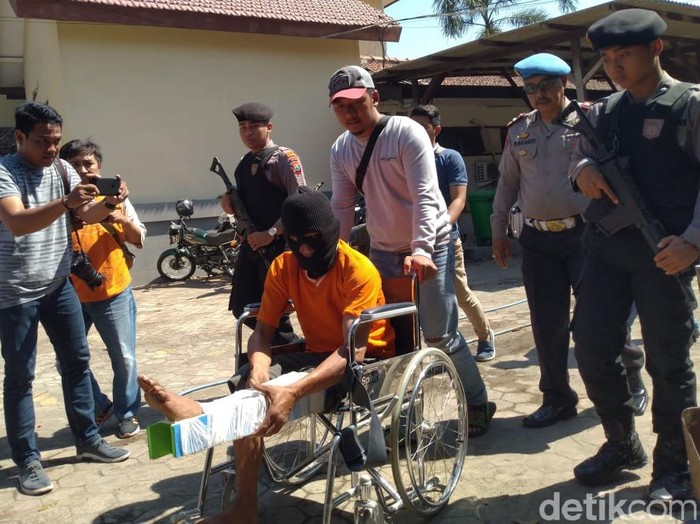Nurhaji (46) memegangi kaki kirinya sambil mengerang kesakitan saat digelandang polisi menggunakan kursi roda. Timah panas dari pistol polisi telah menembus kaki kiri pria asal Desa Brangkal, Kecamatan Balongpanggang, Gresik itu.