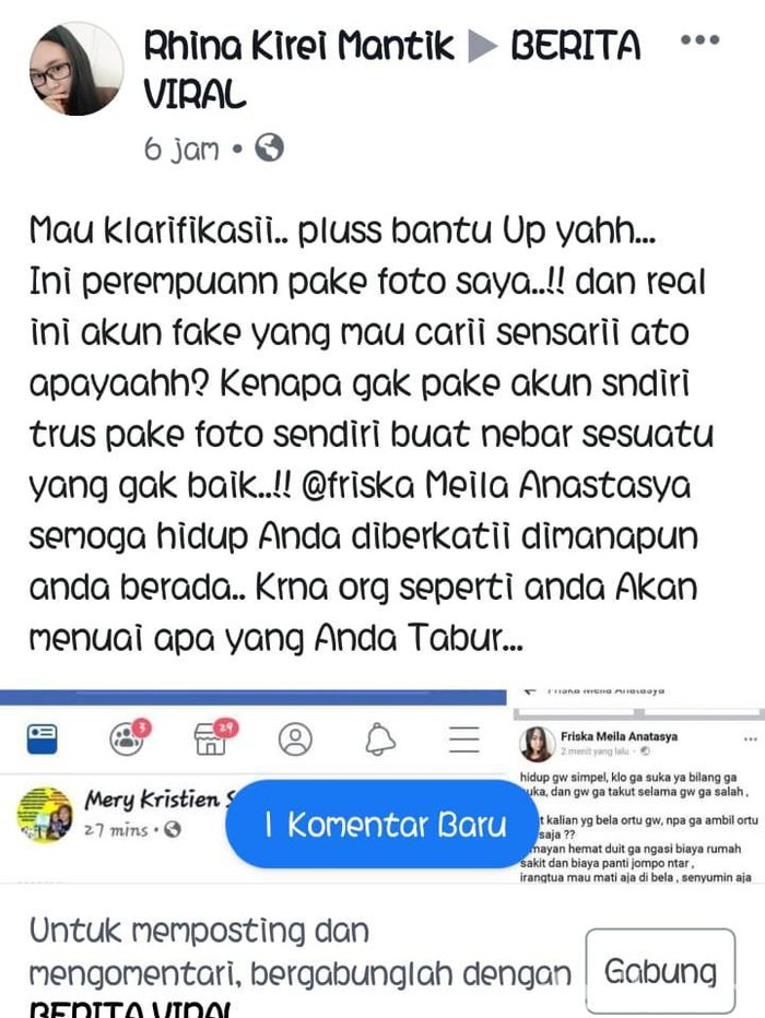 Klaim itu ditulis akun Rhina Kirei Manik pada 17 Oktober 2019 pukul 12.16 WIB. Dalam postingan itu, Rhina berniat mengklarifikasi jika fotonya dipakai dalam postingan akun Friska Meila Anatasya dengan narasi di antaranya sebagai berikut: