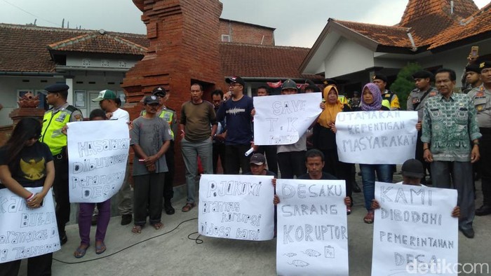 Puluhan warga Padusan yang terdiri atas kaum pria dan emak-emak ini berorasi di halaman kantor desa setempat. Mereka juga membentangkan sejumlah poster bernada protes terhadap Pemerintah Desa Padusan.
