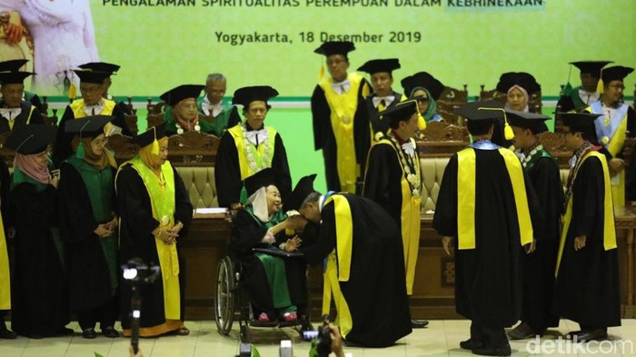"Penganugerahan gelar Doktor H.C bagi Ibu Sinta dari UIN Sunan Kalijaga ini menjadi referensi bagi para ilmuwan untuk bisa mengikuti referensi kehidupan keilmuan, pemikiran serta tindakan seorang ibu Sinta Nuriyah Abdurrahman Wahid. Beliau sosok pembelajar yang mengajarkan dan mengamalkan ilmunya. Itu tidaklah mudah," lanjut Khofifah.