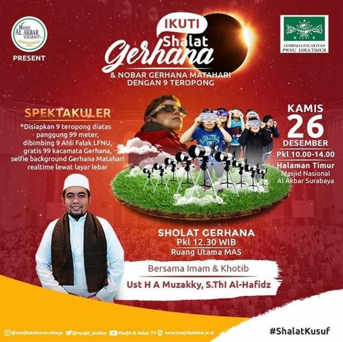 "Selama menonton akan dibimbing 9 ahli falak LFNU Jatim atau ahli astronomi. Dan diberikan gratis 99 kacamata gerhana serta selfie background gerhana matahari realtime lewat layar lebar," terangnya.