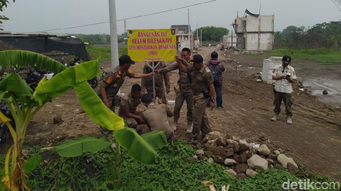 Plakat tersebut bertuliskan 'Bangunan Ini Belum Dilengkapi Izin Mendirikan Bangunan (IMB)'. Tidak hanya itu, petugas penegak Perda ini juga menghentikan paksa aktivitas pembangunan rumah di dalam perumahaan ini.