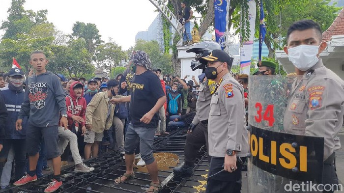 Massa demo tolak Omnibus Law di Surabaya pada Kamis (8/10) sempat ricuh di depan Gedung Negara Grahadi Surabaya. Massa yang tidak mengenakan seragam buruh ini melempari petugas dengan batu hingga bom molotov. Massa juga menjebol pagar sisi kanan dan kiri Grahadi.