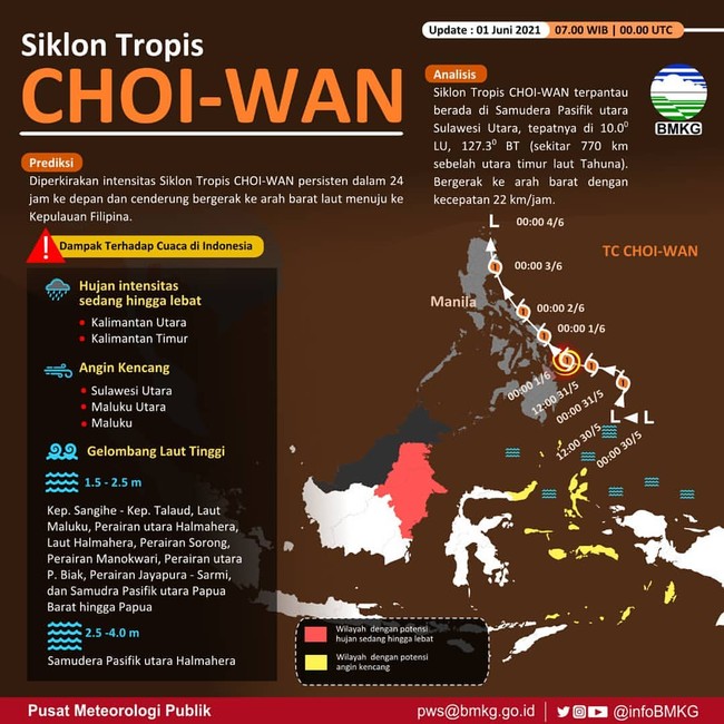 "Terdapat Siklon Tropis Choi Wan 998 hPa di Perairan timur Filipina yang berdampak pada ketinggian gelombang Perairan Utara Kepulauan Sangihe hingga Kepulauan Talaud, Perairan utara Halmahera hingga Papua," kata Ratih tertulis di Surabaya, Rabu (2/6/2021).
