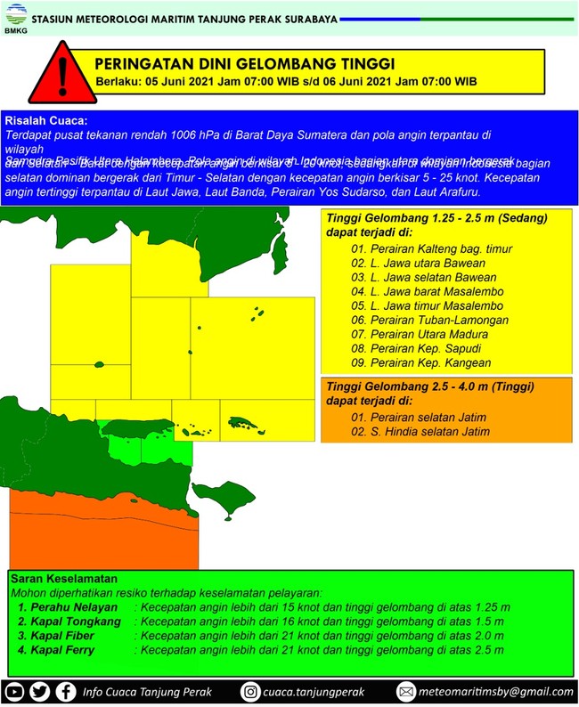"Pola angin di wilayah Indonesia bagian Utara dominan bergerak dari Selatan menuju Barat dengan kecepatan angin berkisar 5-20 knot," kata Arif dalam siaran pers yang diterima detikcom di Surabaya, Jumat (4/6/2021).