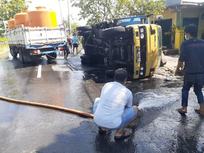 "Truk yang memuat dua tangki isi HCL, saat terguling, cairan HCL nya hingga masuk rumah. Untuk menghilangkan bau yang menyengat warga membersihkan dengan air," kata seorang Wahyuni kepada detikcom di lokasi kejadian, Minggu (13/6/2021).