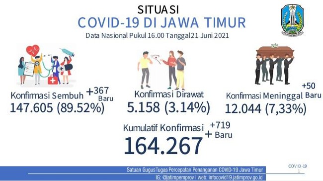 Total kasus kumulatif terkonfirmasi positif COVID-19 di Jatim sebanyak 164.267 kasus. 5.158 kasus di antaranya masih aktif/dalam masa perawatan.