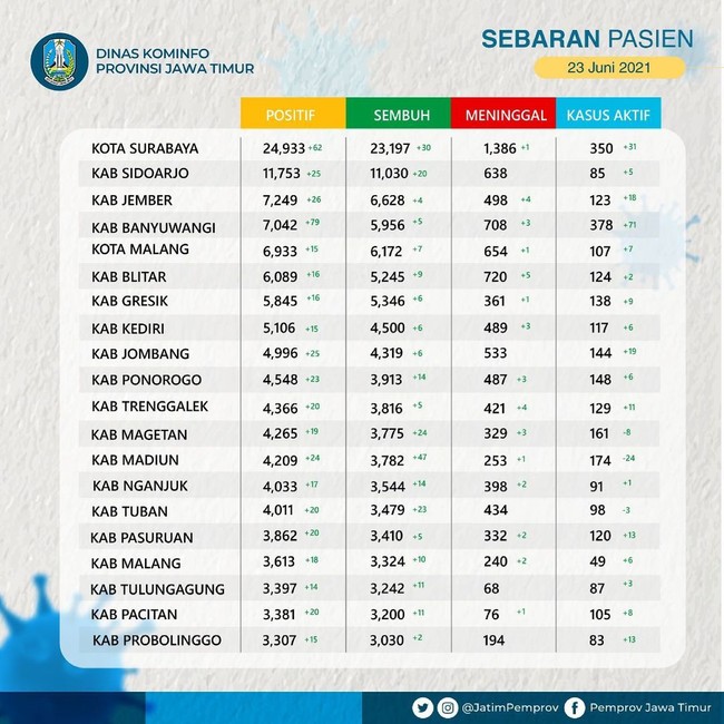 Berikut jumlah kasus aktif di Jatim pada Kamis (24/6/2021).