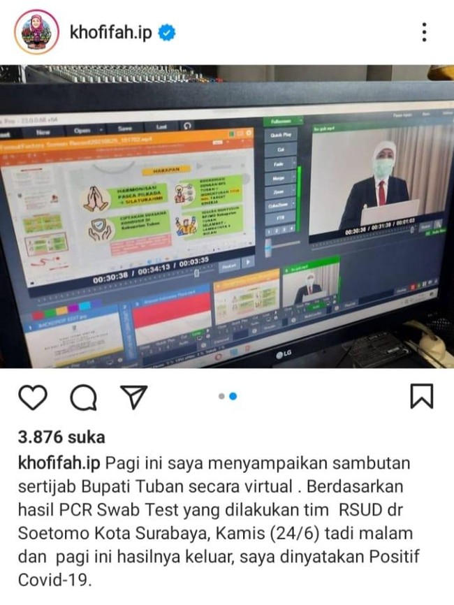 Dalam instagramnya, Khofifah mengunggah dua foto yang memperlihatkan dirinya sedang memberikan sambutan secara virtual di acara Serah Terima Jabatan (Sertijab) Bupati Tuban.