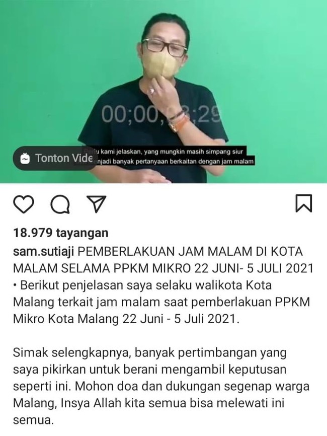 Hal ini disampaikan Wali Kota Malang Sutiaji melalui akun resmi instagramnya, @sam.sutiaji.