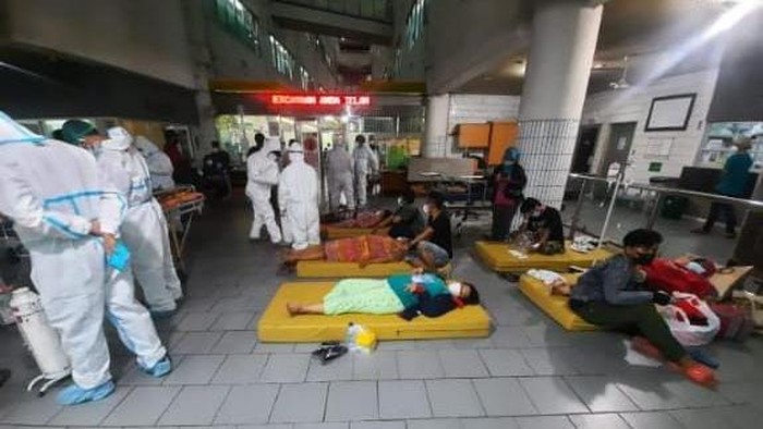 "Di ruangan ada 330 pasien, overload. Untuk data di IGD per tanggal 26 Juni pukul 07.00 WIB tadi pasien triage 3 pasien, di IGD lantai 1 ada 34 pasien, Res non COVID-19 1 pasien, Res COVID-19 9 pasien, pasien IGDM ada 28, Buffer 44 pasien, penapisan 4 pasien dan pasien di NICU IRD ada 3. Totalnya ada 126 pasien," kata dr Joni, Sabtu (26/6/2021).
