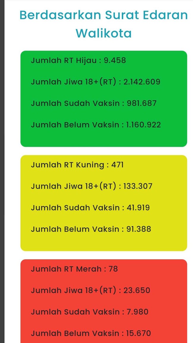 Di wilayah 9.458 RT zona hijau, terdapat 2.142.609 jiwa usia 18+. 981.687 sudah menjalani vaksinasi, dan 1.160.922 belum disuntik vaksin COVID-19.