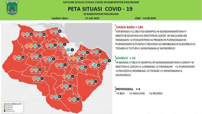 "Perlu kami sampaikan bahwa hari ini sungguh memprihatinkan. Karena 195 orang yang terpapar dalam satu hari. Dan ini warga Kabupaten Pasuruan," kata Jubir Satgas COVID-19 Kabupaten Pasuruan, Syaifudin Ahmad, Selasa (13/7/2021).