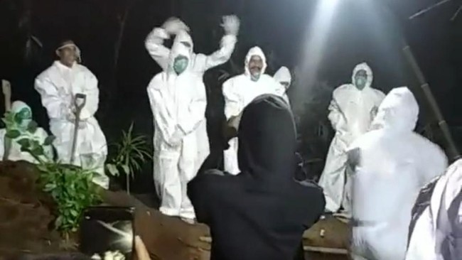 Rekaman itu memperlihatkan belasan orang berkumpul di sekitar lahat tempat pemakaman umum. Mereka seperti sedang menunggu kedatangan jenazah COVID-19.