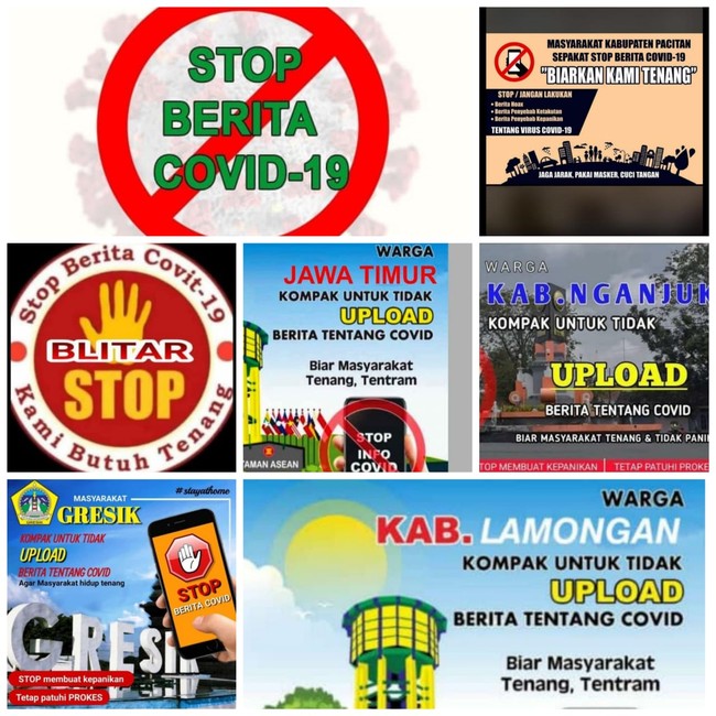 "Warga Jawa Timur kompak untuk tidak upload berita tentang COVID-19. Biar masyarakat tenang, tentram, stop info COVID," tulis salah satu poster yang dilihat detikcom, Rabu (14/7/2021).