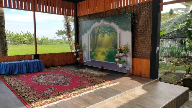 Layaknya sebuah pelaminan, di latar belakang 'gazebo nikah' ini juga terpasang backdrop dan bunga-bunga hias untuk mempercantik suasana. Nuansa riang dari sebuah pelaminan hadir di gazebo nikah ini melalui pernik hiasan tersebut dan juga karpet merah. Suasana ruang terbuka juga langsung terasa karena gazebo ini berdiri di belakang kantor dan menghadap areal hijau persawahan.