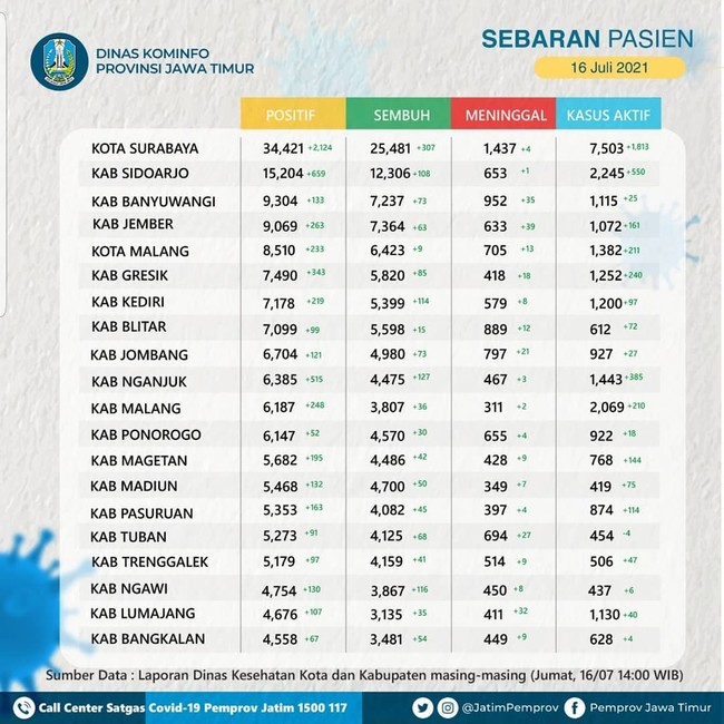 Berikut persebaran kasus aktif di Kabupaten atau Kota di Jatim pada Kamis (17/7/2021):