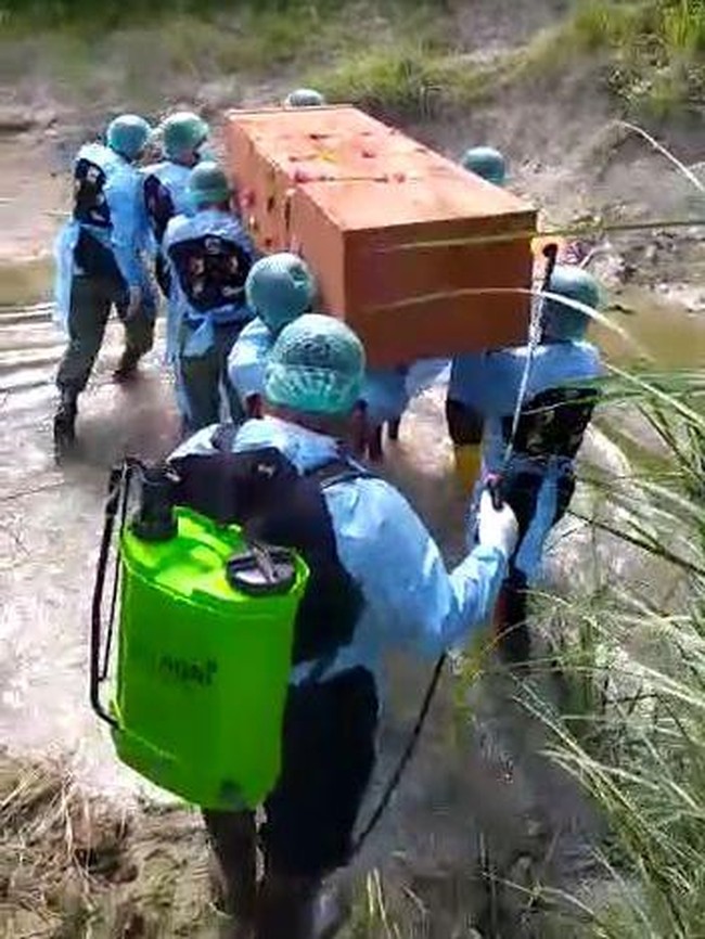 Dengan bersusah payah, mereka bergantian memanggul peti mati dan harus melawan derasnya sungai. Di belakang peti mati yang digotong, tampak seorang petugas menyemprotkan disinfektan.