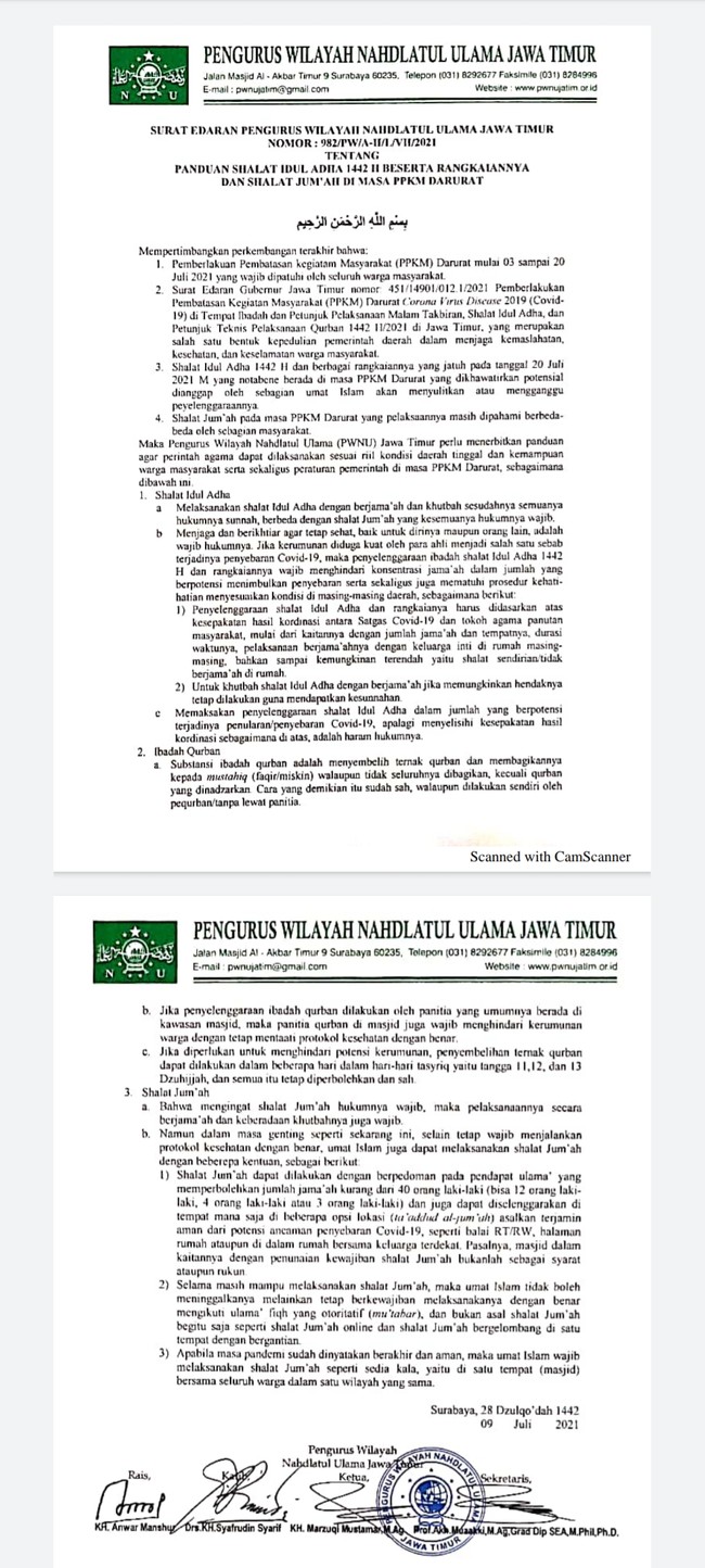 SE bernomor 982/PW/A-II/L/II/2021 ini menganjurkan Salat Idul Adha digelar di rumah saja. SE ini ditandatangani Rais Syuriah PWNU Jatim KH Anwar Manshur, Katib Syuriah KH Syafruddin Syarif, Ketua Tanfidziyah PWNU Jatim KH Marzuki Mustamar, dan Sekretaris Tanfidziyah Akhmad Muzakki.