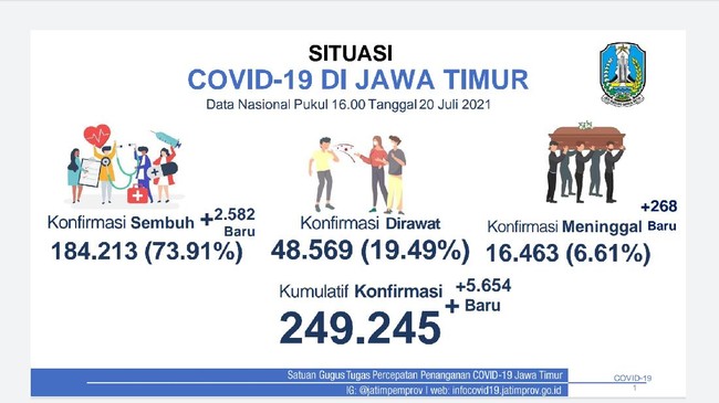Sementara itu, kumulatif kasus COVID-19 di Jatim ada 249.245. Sedangkan kasus aktif yang masih dirawat hingga isolasi mandiri ada 48.569. Lalu, untuk tambahan pasien COVID-19 yang sembuh ada 2.582 orang dengan kumulatif pasien sembuh ada 184.213 orang.