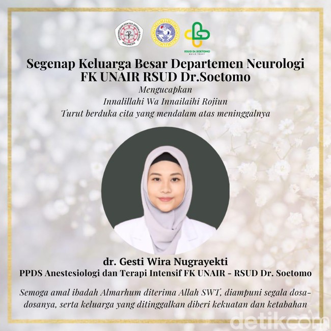 "Dokter Gesti adalah salah satu putra terbaik FK UNAIR. Beliau baru saja diterima sebagai PPDS Anestesi pada periode Januari 2021. Kami merasakan duka cita yang mendalam. Semoga pengabdiannya selama ini diganjar dengan tempat terbaik di sisi-Nya," kata Prof Bus.