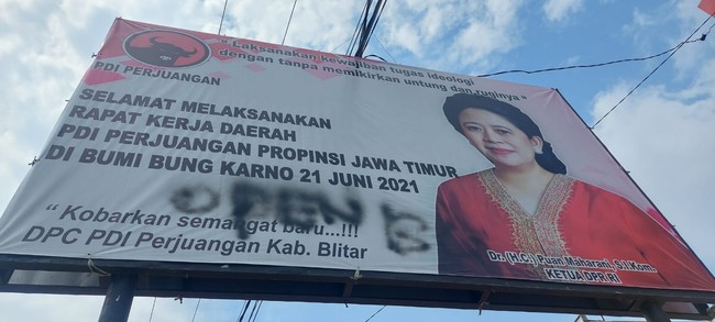 Dalam baliho itu, Puan Maharani mengucapkan 'Selamat melaksanakan Rapat Kerja Daerah PDIP Jawa Timur. Di Bumi Bung Karno 21 Juni 2021'. Tepat di bawah tulisan itu, ada semprotan cat hitam berhuruf kapital 'OPEN BO'.