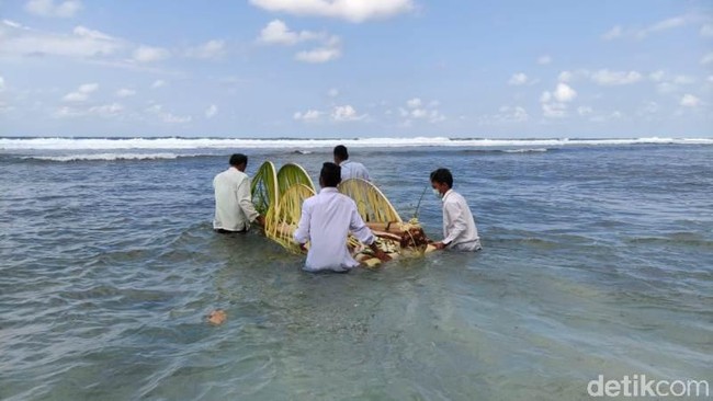 Bersamaan usainya pembacaan doa, beberapa pria bergegas menuju tempat sesaji berada. Mereka lantas mengangkat rakitan batang pisang dengan ornamen janur. Diiringi teriakan takbir, mereka lalu membawanya ke laut.