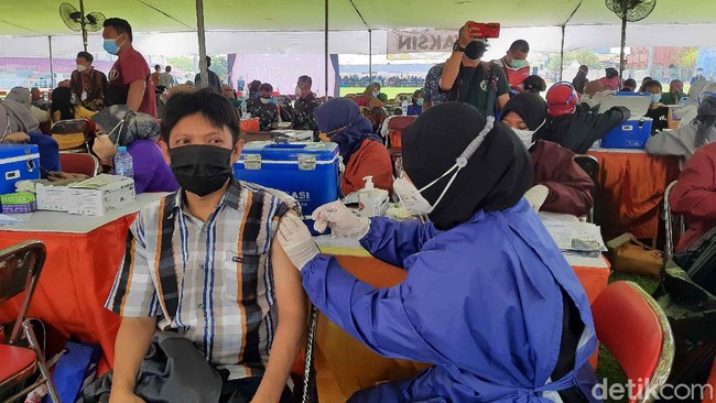Vaksinasi COVID-19 di Gelora Pancasila terbagi dua tenda, A dan B. Di masing-masing tenda ada tempat screening dan vaksinasi. Di dalam tenda tidak dipenuhi oleh peserta. Saat screening dan suntik vaksin juga tertib.