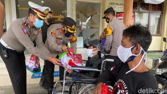 Selain memberikan sembako, polisi juga memberikan Bendera Merah Putih kepada disabilitas. Ini sebagai simbol semangat kebangsaan bersama-sama berperang melawan COVID-19.