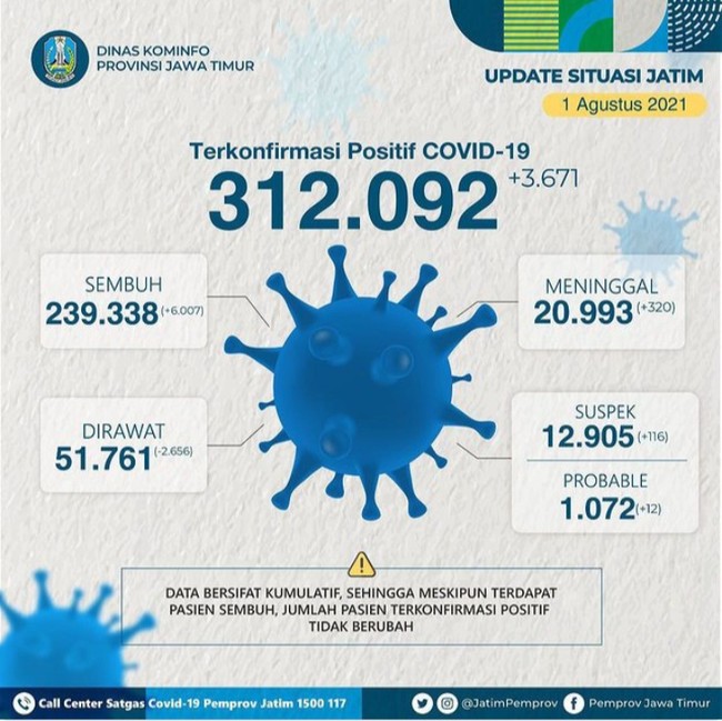 Dari data yang diunggah infocovid19.jatimpemprov.go.id, selama 30 hari PPKM darurat, ada tambahan 136.274 kasus positif COVID-19 di Jatim.